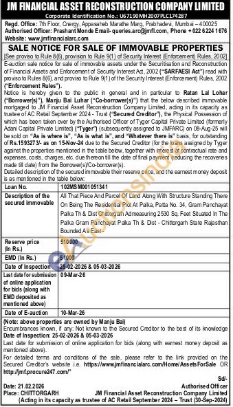 All That Piece And Parcel Of Land Along With Structure Standing There On Being The Residential Plot At Palka, Patta No. 34, Gram Panchayat Palka Th & Dist Chittorgarh Admeasuring 2530 Sq. Feet Situated in The Palka Gram Panchayat Paka Th & Dist-Chittorgarh State Rajasthan Bounded As East