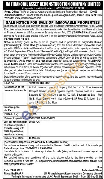 All that preace and parcel of Property Flat No. 1 at 3rd Floor known as Ganapati Sadan, situated opposite Idgaah Bhawan, Nethelav Colony Baswara 327001 measuring approx 700 Sqft. Bounded as East - Plot No. 8. West-Gallery, North-Open Gallery & GF Road 30 ft. South-Stair case & Flat No. 2, 3rd Floor