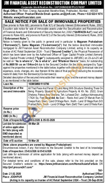 All That Piece And Parcel Of Land Along With Structure Standing There On Being Property Situated At Agriculture Property At Kh. No. 252/2, Gram Dhelana, Patwar Area Dhelana. Teh. Lohawat Dist-Jodhpur Admeasuring 17424 Sq. Feet Bounded As East Rasta And Land Of Manak Ram & Deepa Ram, West-Land Of Maga Ram, North-Land Of Maga Ram S/O Prahlad Ram, South-Land Of Maga Ram (Self) Then Land Of Neta Ram