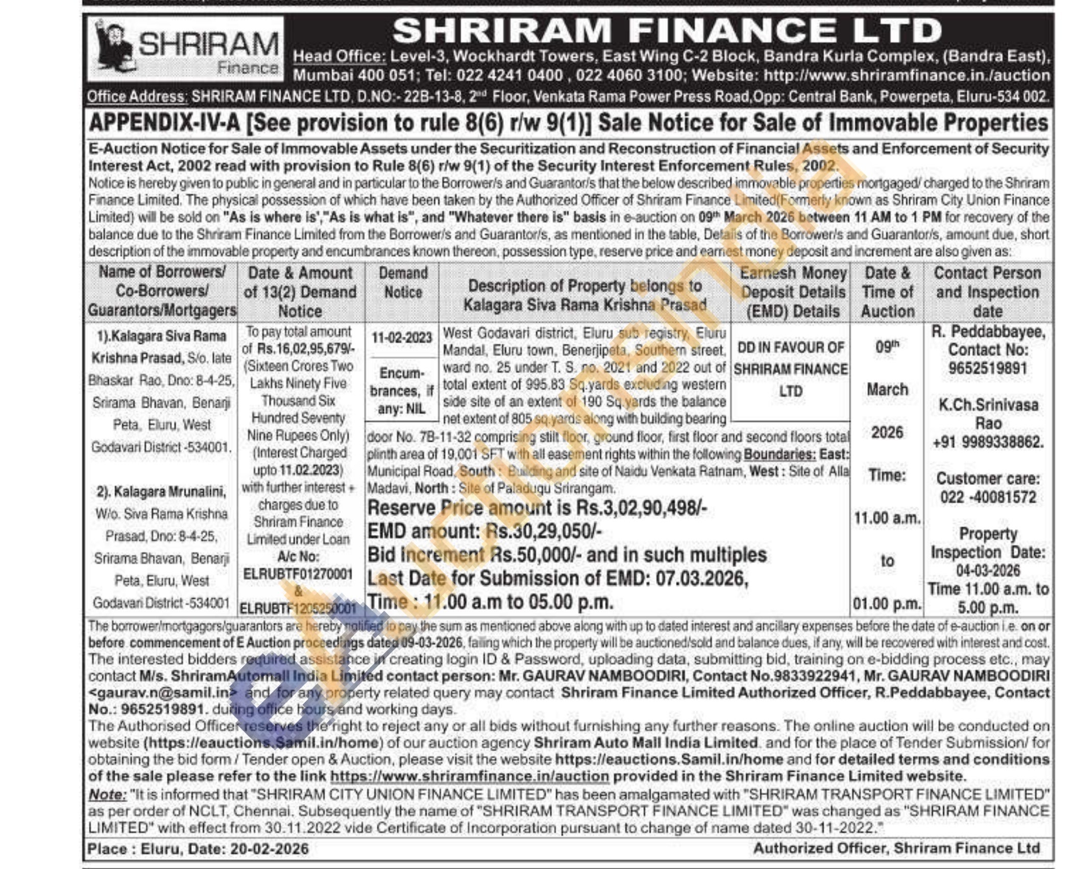 West Godavari district, Eluru sub registry, Eluru Mandal, Eluru town, Benerjipeta, Southern street, ward no. 25 under T. S. no. 2021 and 2022 out of total extent of 995.83 Sq.yards excluding western side site of an extent of 190 Sq yards the balance net extent of 805 sq.yards along with building bearing door No. 78-11-32 comprising stilt floor, ground floor, first floor and second floors total plinth area of 19,001 SFT