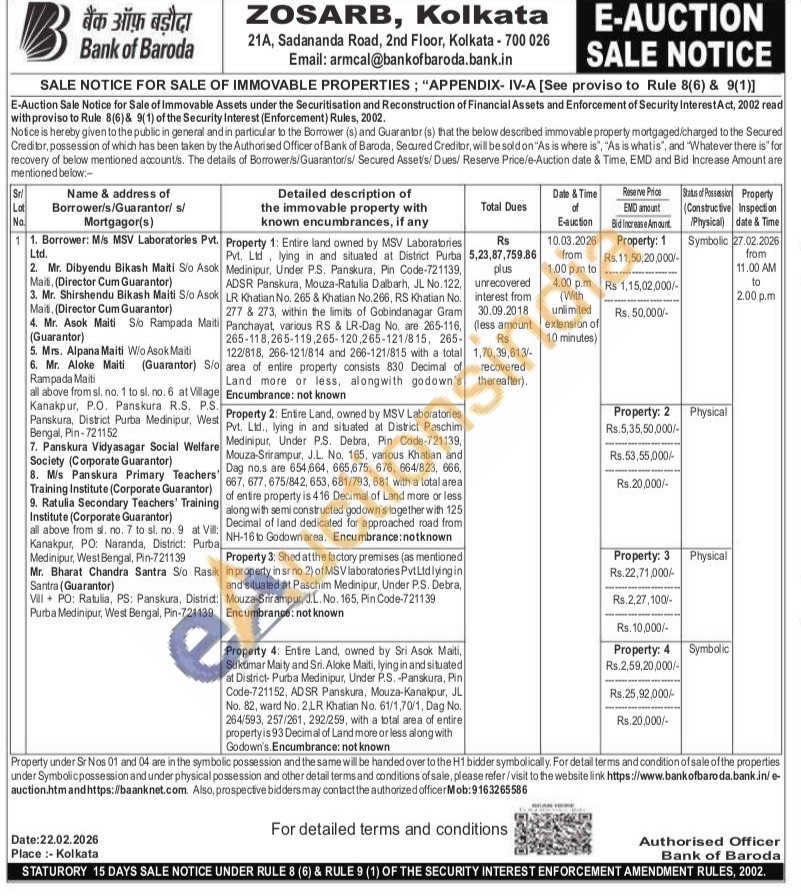 Property 3: Shed at the factory premises (as mentioned in property in srno 2) of MSV laboratories Pvt Ltd lying in and situated at Paschim Medinipur, Under P.S. Debra, Mouza-Srirampur, J.L. No. 165, Pin Code-721139 Encumbrance: not known