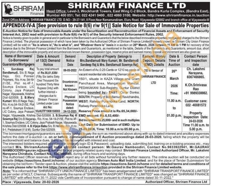 An Extent of Ac.0.25 Cents or 1210 sq. yards of vacant residential site bearing Demarcation No. 150/1, situate in KAZA Village and Gram Panchayat Area, Mangalagiri Mandal, PEDAKAKANI Sub-Registry, Guntur District being bounded by:- EAST: Circar Donka; SOUTH: Property of Bandlamudi Ravichandra, WEST: Railway Poramboka Land; NORTH: Railway Poramboka Land;