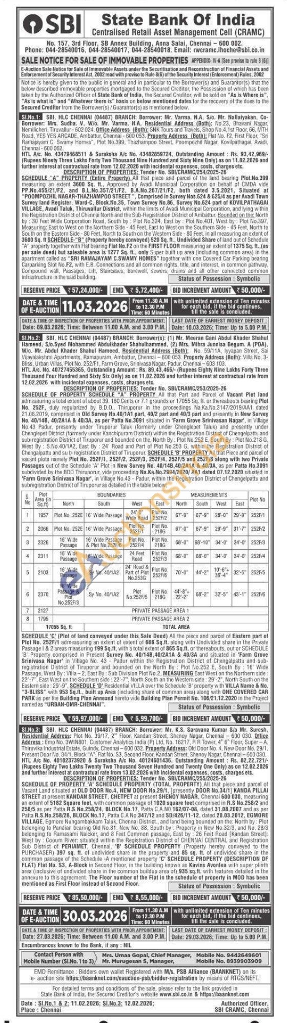 SCHEDULE OF PROPERTY SCHEDULE "A" PROPERTY All that Part and Parcel of Vacant Plot land admeasuring a total extent of about 39. 160 Cents or 7.1 grounds or 17055 Sq. ft. or thereabouts bearing Plot No. 252F, duly regularized by B.D.O., Thiruporur in the proceedings Na.Ka.No.3147/2019/AA1 dated 21.06.2019, comprised in Old Survey No.40/1A1 part, 40/2 part and 40/3 part and presently in New Survey No. 40/148, 40/2A1A & 40/3A, as per Patta No.3091 situated in 'Farm Grove Srinivasan Nagar', in Village No.43 Padur, presently under Tiruporur Taluk (formerly under Chenglepet Taluk) and presently under Chenglepet District (formerly under Kanchipuram District) within the Registration District of Chengelpattu and sub-registration District of Tiruporur and bounded on the, North By: Plot No.252 E, South By: Plot No.218 G, West By: S.No.40/1A2, East By: 24 Road and Part of Plot No.253 G, within the Registration District of Chengalpattu and sub-registration District of Tiruporur SCHEDULE 'B' PROPERTY All that Piece and parcel of vacant plots namely Plot No. 252F/1, 252F/2, 252F/3, 252F/4, 252F/5 and 252F/6 along with two Private Passages out of the Schedule "A" Plot in New Survey No. 40/148,40/2A1A & 40/3A, as per Patta No.3091 subdivided by the BDO Thiruporur, vide proceeding Na.Ka.No.2994/2020/AA1 dated 07.12.2020 situated in 'Farm Grove Srinivasa Nagar", in Village No.43-Padur, within the Registration District of Chengelpattu and subregistration District of Tiruporur as detailed in the table below,
