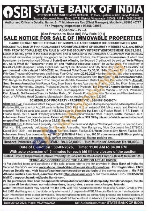 SCHEDULE-A: Prakasam District, Ongole Sub Registration area, Ongole Muncipal corporation, Mamidipalem Gram Patta No.289, an extent of Ac.0.84 cents in Sy No.224/3, Plot No.3 an extent of 904.1/9 sq yards and Plot No.4 an extent of 178.5/9 sq. yards total extent of 1082.6/9 sq yards bounded by: East: 30 Ft wide Road-117 ft. South: 15 Ft wide Road-85.6 ft. West: Property of Achchukolu Ramakrishnamma and other-106.6 ft, North: Plot No.2-89 ft. In between these four boundaries an Extent of 1082.6 Sq.yds or 909.38 Sq.mts out of which an undivided and unspecified Share in 27.06 Sq.yds or 22.622 Sq.mts. and SCHEDULE-B: In Schedule A property, constructed in the name and style of "Sri Surya Homes", in Second Floor, Flat No. 302, property belonging Smt Swarna Anuradha, W/o Rangarao, Vide Document No:287/2021, Dated: 08.01.2021, and bounded by: East: Corridor, South: Flat No 301, West: Open to Sky, North: Flat No. 303. In between these four boundaries an 1100 Sft (900 Sft of Plinth area, 200 Sft common area) 80 Sft car parking in stilt floor with all easement rights, current services, electrical fittings parking etc.,