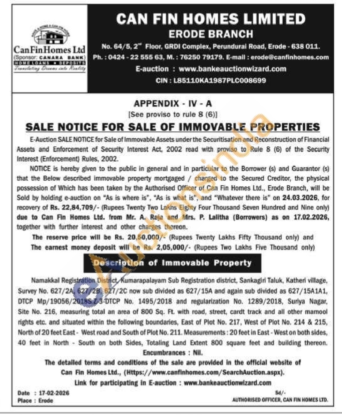 Namakkal Registration District, Kumarapalayam Sub Registration district, Sankagiri Taluk, Katheri village, Survey No. 627/2A, 627/28, 627/2C now sub divided as 627/15A and again sub divided as 627/15A1A1, DTCP Mp/19056/2018S.Z-3-DTCP No. 1495/2018 and regularization No. 1289/2018, Surlya Nagar, Site No. 216, measuring total an area of 800 Sq. Ft. with road, street, cardt track and all other mamool rights etc. and situated within the following boundaries, East of Plot No. 217, West of Plot No. 214 & 215, North of 20 feet East-West road and South of Plot No. 211. Measurements: 20 feet in East-West on both sides, 40 feet in North South on both Sides, Totaling Land Extent 800 square feet and building thereon.