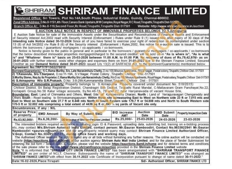 Description of immovable property: Property belongs to S. Annapurna Property covered under document No. 518/2015) Chittoor District, Sri Balaji Registration District, Chandragiri Sub District, Tirupathi Rural Mandal, C-Mallavaram Gram Panchayat, No.22. Gollapalli Group, No. 56 Kalur village accounts, Sy.No.48-7A, 7B and 7C near Harijanawada of vacant House Site, Boundaries: East: Land of Chinnakka and Others, West: Site of Kandaswamy Dharani, North Land of Yerraguravagan Chengareddy and Others South: Road leading to Srinivasamangapuram. Within these site admeasuring East to West on Northern side 23 ft or 7.015 mts and East to West on Southern side 27.7 ft or 8.448 mts North to South Eastern side 179.7 ft or 54.808 mts and North to South Western side 170-5 ft or 52.002 mts comprising a total extent of 4439 sq ft or 493 % sq yards of Vacant site only