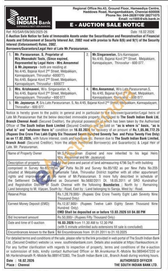 All that piece and parcel of land admeasuring 4796 Sq.Ft with building comprised in Survey No.85/18 as per Patta No.39 and Survey No.85/182 as per New Patta No.205 situated at Melpakkam Village, Poonamalle Taluk, Thiruvallur District together with all other appurtenant rights and improvements in the name of Mr.Parasuraman. S more fully described in schedule of the Settlement Deed Registered as Document No.5692/2011 Dt. 18.05.2011 of SRO Kundrathur and Registration District of South Chennai with the following Boundaries: North by Remaining Land belonging to M. Vijayan, South by: Road, East by: Land belonging to Saroja, West by: Road.