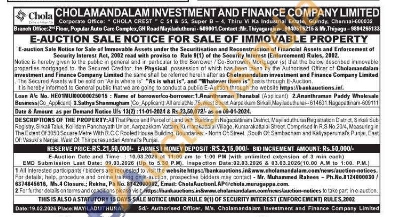DESCRIPTIONS OF THE PROPERTY: All That Piece and Parcel of Land with Building in Nagapattinam District, Mayiladuthurai Registration District, Sirkali Sub Registry, Sirkali Taluk, Kollidam Panchayath Union, Aarpaakkam Vattam, Kumarakattalai Village, Kumarakattalai Street, Comprised In R.S No.20/4, Measuring in The Extent Of 3050 Square Metre With R.C.C Roofed House Building. Boundaries:-North Of: Street, South Of Sambadham and Kaliyaperumal's Punjai. East Of: Vasuki's Nanjai. West Of: Thiripurasundari Ammal's Punjai
