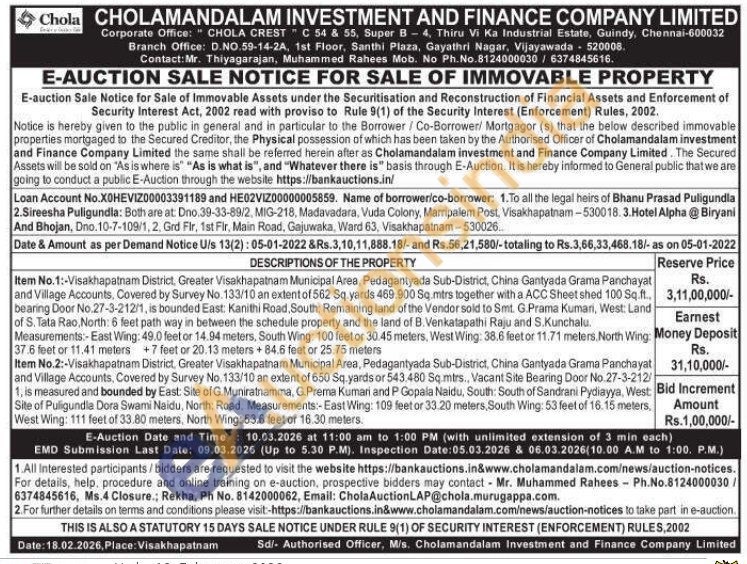Item No.1:-Visakhapatnam District, Greater Visakhapatnam Municipal Area, Pedagantyada Sub-District, China Gantyada Grama Panchayat and Village Accounts, Covered by Survey No. 133/10 an extent of 562 Sq.yards 469.900 Sq.mtrs together with a ACC Sheet shed 100 Sq.ft.. bearing Door No.27-3-212/1, is bounded East: Kanithi Road, South: Remaining land of the Vendor sold to Smt. G.Prama Kumari, West: Land of S. Tata Rao, North: 6 feet path way in between the schedule property and the land of B. Venkatapathi Raju and S.Kunchalu. Measurements:-East Wing: 49.0 feet or 14.94 meters, South Wing: 100 feet or 30.45 meters, West Wing: 38.6 feetor 11,71 meters. North Wing: 37.6 feet or 11.41 meters +7 feet or 20.13 meters + 84.6 feet or 25.75 meters Item No.2:-Visakhapatnam District, Greater Visakhapatnam Municipal Area, Pedagantyada Sub-District, China Gantyada Grama Panchayat and Village Accounts, Covered by Survey No. 133/10 an extent of 650 Sq.yards or 543.480 Sq mtrs., Vacant Site Bearing Door No.27-3-212/1, is measured and bounded by East: Site of G.Muniratnamma, G. Prema Kumari and P Gopala Naidu, South: South of Sandrani Pydiayya, West: Site of Puligundla Dora Swami Naidu, North: Road. Measurements:-East Wing: 109 feet or 33.20 meters, South Wing: 53 feet of 16.15 meters. West Wing: 111 feet of 33.80 meters. North Wing: 53.6 feet or 16.30 meters.