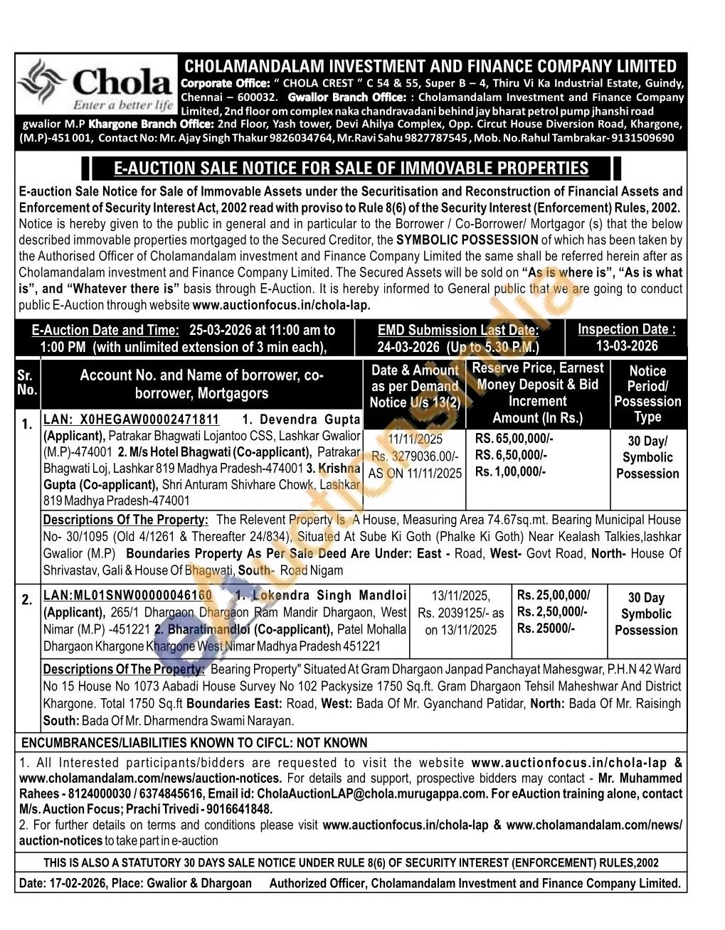 Mr. Muhammed Rahees-8124000030/6374845616,M/s. Auction Focus; Prachi Trivedi-9016641848