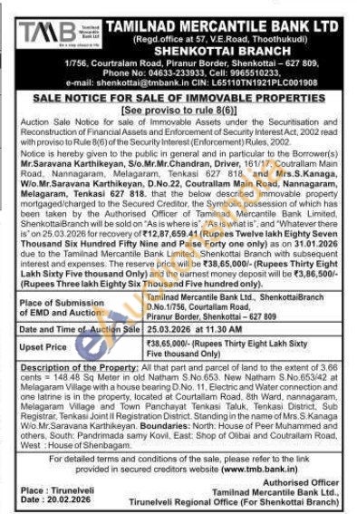 Description of the Property: All that part and parcel of land to the extent of 3.66 cents 148.48 Sq Meter in old Natham S.No 653. New Natham S.No.653/42 at Melagaram Village with a house bearing D.No. 11. Electric and Water connection and one latrine is in the property, located at Courtallam Road, 8th Ward, nannagaram, Melagaram Village and Town Panchayat Tenkasi Taluk, Tenkasi District, Sub Registrar, Tenkasi Joint II Registration District. Standing in the name of Mrs. S. Kanaga W/o Mr.Saravana Karthikeyan. Boundaries: North. House of Peer Muhammed and others, South: Pandrimada samy Kovil, East: Shop of Olibal and Coutrailam Road, West: House of Shenbagam
