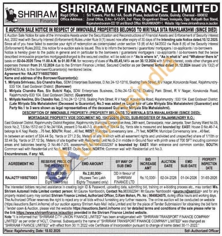 East Godavari District, Rajahmundry District Registrar, Rajahmundry Municipal Corporation Area, 24th ward, Danavalpeta, near Jampeta, Town Survey Ward No.05, block No.2, T.S.No.157/2 old D No.24/190A, present D No.46-7-3, an extent of 324.44 Sq. Yards site is measured and bounded by: EAST: House D No.46-7-4, belongs to K Nagi Reddy...75 feet, SOUTH: Road...40 feet, WEST: Municipal Conversancy lane...71 feet, NORTH: Municipal Conversancy lane ...40 feet. In between an extent of 324.44 Sq. Yards or 271.2 Sq. Meters of site in which with all easement rights and undivided and unspecified share of 1/10th or 32.44 Sq. Yards or 27.12 Sq. Meters of site together with Residential unit No.G-2 in middle in Ground floor with plinth area of 700 SFT including common areas and balconies bearing D No.46-7-2/3, assessment No.10640032267 is bounded by: EAST: Main entrance and common corridor, SOUTH: Common wall with Residential unit No.1, WEST: Open Space, NORTH: Common wall with Residential unit No.3.