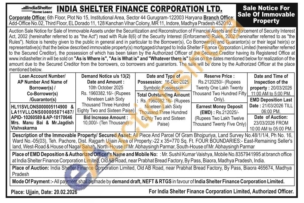 Description of the Immovable Property/ Secured Asset: All Piece And Parcel Of Gram Bhojpuriya, Land Survey No.48/1/1/4, Ph No. 16, Ward No.-05(03), Teh. Pachore, Dist. Rajgarh Ujjain Area of Property:-22 x 35=770 Sq. Ft. FOUR BOUNDARIES:- East-Remaining Seller's land, West-Road & House of Nagar Sahab, North-House of Mr. Abhaysingh Parmar, South-House of Mr. Abhaysingh Parmar