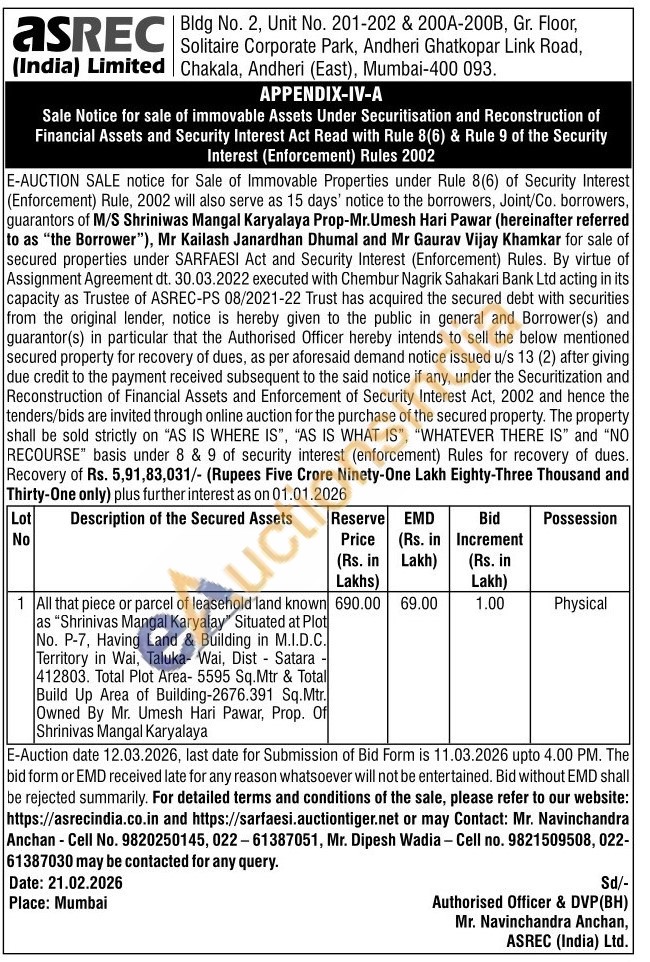 All that piece or parcel of leasehold land known as "Shrinivas Mangal Karyalay" Situated at Plot No. P-7, Having Land & Building in M.I.D.C. Territory in Wai, Taluka- Wai, Dist - Satara -412803. Total Plot Area- 5595 Sq.Mtr & Total Build Up Area of Building-2676.391 Sq.Mtr. Owned By Mr. Umesh Hari Pawar, Prop. Of Shrinivas Mangal Karyalaya