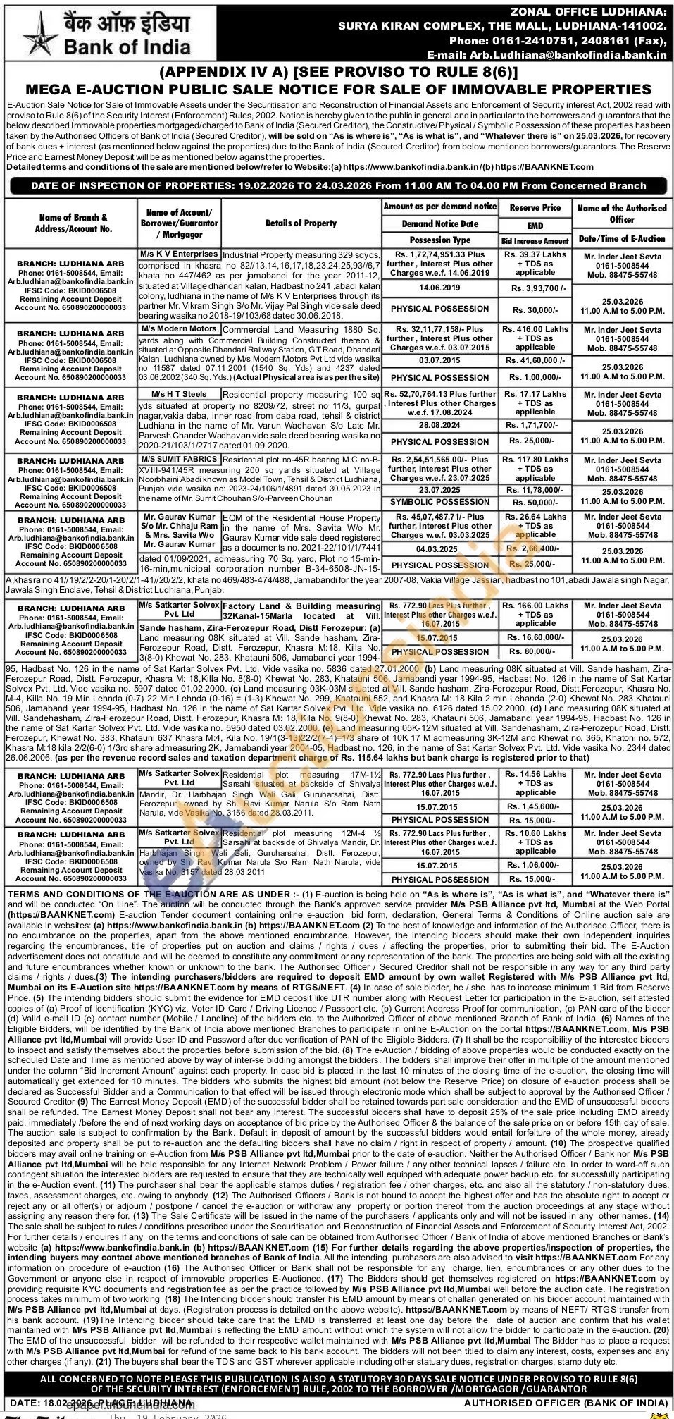 BRANCH: LUDHIANA ARB Phone No : 0161-5008544 / Authorised Officer : Mr. Inder Jeet Sevta Contact No : 01615008544 / Mobile No : 8847555748