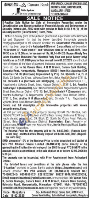 Details and full description of the Immovable properties with known encumbrances, if any: All that part and parcel of the property bearing PID NO. 24-118-29A, SAS 3856/2747/A/1 bearing 1st floor and 2nd floor having plinth area 1716 sq ft each situated on ward no. 09, Block 23, South 3rd Cross Road. Vaikunta Street, Belur Taluk, Hassan District, Boundaries: East: Property of Lakshmana, West: Property of Keshava Kiran, North: Municipal Road, South: Property of Nagarathna