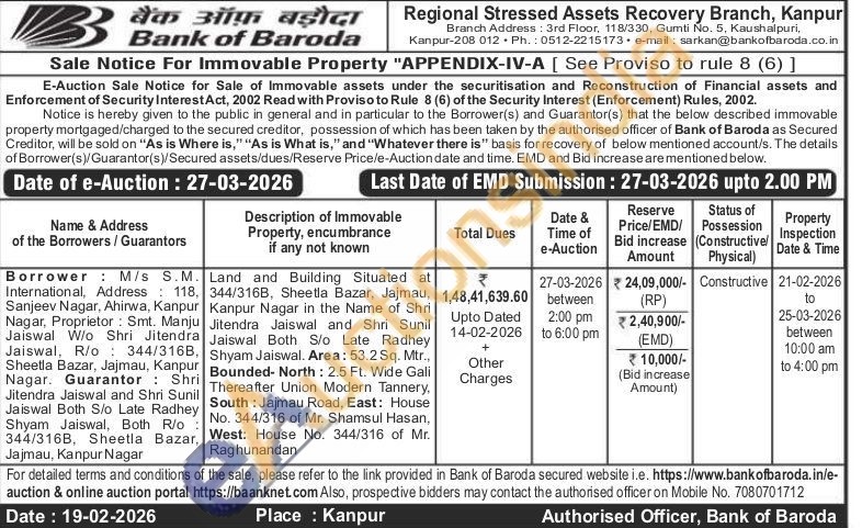 Land and Building Situated at 344/316B, Sheetla Bazar, Jajmau, Kanpur Nagar in the Name of Shri Jitendra Jaiswal and Shri Sunil Jaiswal Both S/o Late Radhey Shyam Jaiswal. Area: 53.2 Sq. Mtr., Bounded- North: 2.5 Ft. Wide Gali Thereafter Union Modern Tannery, South: Jajmau Road, East: House No. 344/316 of Mr. Shamsul Hasan, West: House No. 344/316 of Mr. Raghunandan