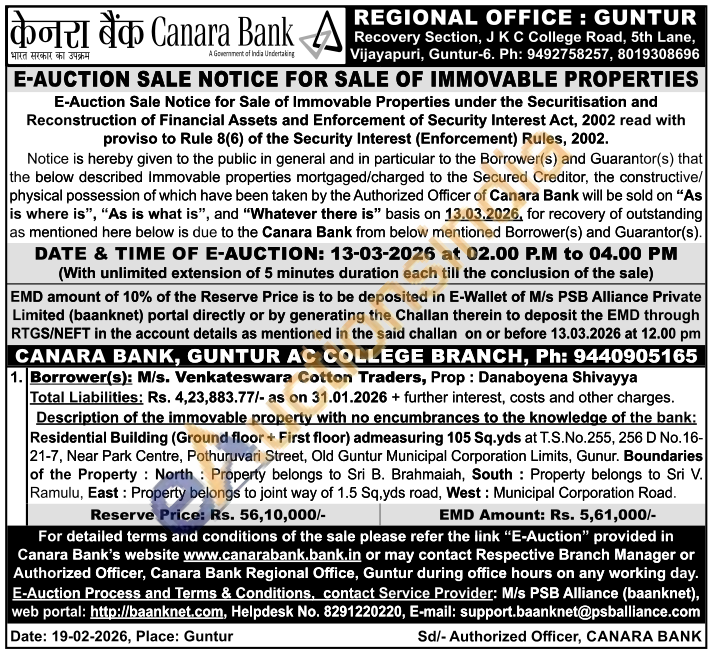 Description of the immovable property with no encumbrances to the knowledge of the bank: Residential Building (Ground floor + First floor) admeasuring 105 Sq.yds at T.S.No.255, 256 D No. 16-21-7, Near Park Centre, Pothuruvari Street, Old Guntur Municipal Corporation Limits, Gunur. Boundaries of the Property: North Property belongs to Sri B. Brahmaiah, South Property belongs to Sri V. Ramulu, East: Property belongs to joint way of 1.5 Sq,yds road, West: Municipal Corporation Road