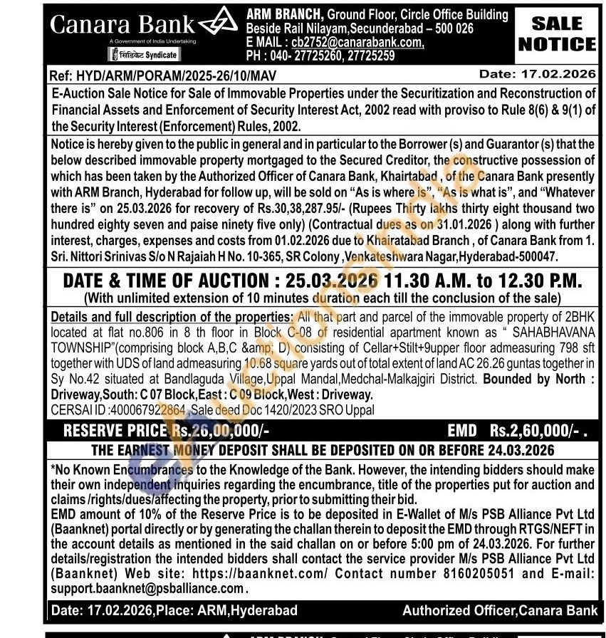 Details and full description of the properties: All that part and parcel of the immovable property of 2BHK located at flat no.806 in 8 th floor in Block C-08 of residential apartment known as "SAHABHAVANA TOWNSHIP" (comprising block A,B,C & D) consisting of Cellar+Stilt+9upper floor admeasuring 798 sft together with UDS of land admeasuring 10.68 square yards out of total extent of land AC 26.26 guntas together in Sy No.42 situated at Bandlaguda Village, Uppal Mandal, Medchal-Malkajgiri District. Bounded by North: Driveway, South: C 07 Block, East: C 09 Block, West: Driveway.