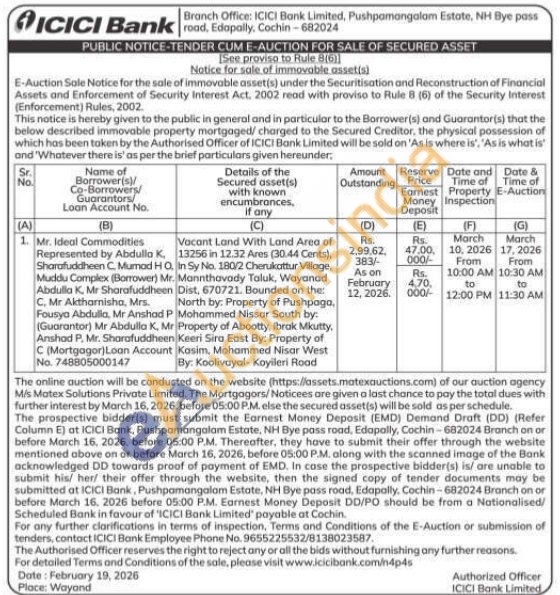 Vacant Land With Land Area of 13256 in 12.32 Ares (30.44 Cents), In Sy No. 180/2 Cherukattur Village, Mannthavady Taluk, Wayanad Dist, 670721. Bounded on the: North by: Property of Pushpaga, Mohammed Nissar South by: Property of Abootty, Ibrak Mkutty, Keeri Sira East By: Property of Kasim, Mohammed Nisar West By: Koolivayal- Koyileri Road