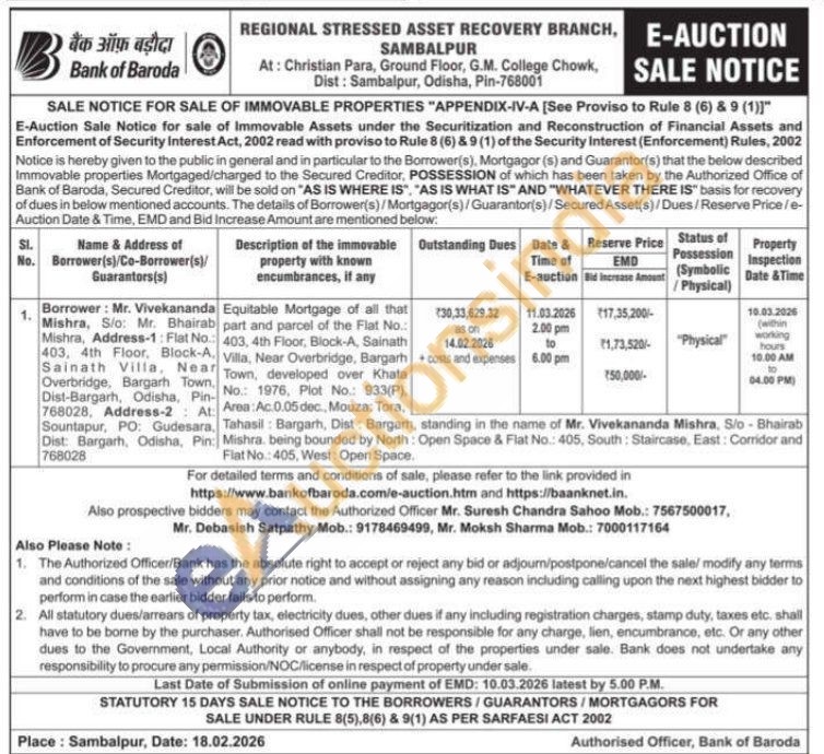 Equitable Mortgage of all that part and parcel of the Flat No.: 403, 4th Floor, Block-A, Sainath Villa, Near Overbridge, Bargarh Town, developed over Khata No.: 1976, Plot No.: 933(P). Area: Ac 0.05 dec., Mouza: Tora, Tahasil Bargarh, Dist: Bargarh, standing in the name of Mr. Vivekananda Mishra, S/o-Bhairab Mishra, being bounded by North: Open Space & Flat No.: 405, South: Staircase, East: Corridor and Flat No.: 405, West: Open Space.