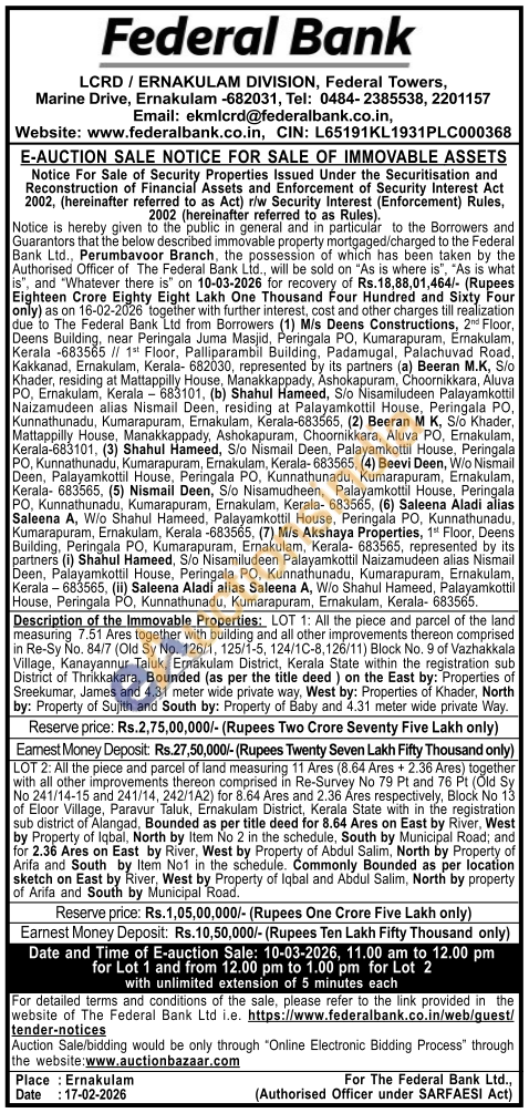 Description of the Immovable Properties: LOT 1: All the piece and parcel of the land measuring 7.51 Ares together with building and all other improvements thereon comprised in Re-Sy No. 84/7 (Old Sy No. 126/1, 125/1-5, 124/1C-8,126/11) Block No. 9 of Vazhakkala Village, Kanayannur Taluk, Ernakulam District, Kerala State within the registration sub District of Thrikkakara, Bounded (as per the title deed) on the East by: Properties of Sreekumar, James and 4.31 meter wide private way, West by: Properties of Khader, North by: Property of Sujith and South by: Property of Baby and 4.31 meter wide private Way