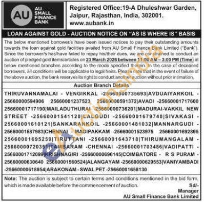 AU Small Finance Bank Gold Auctions Auction in Tiruvannamalai