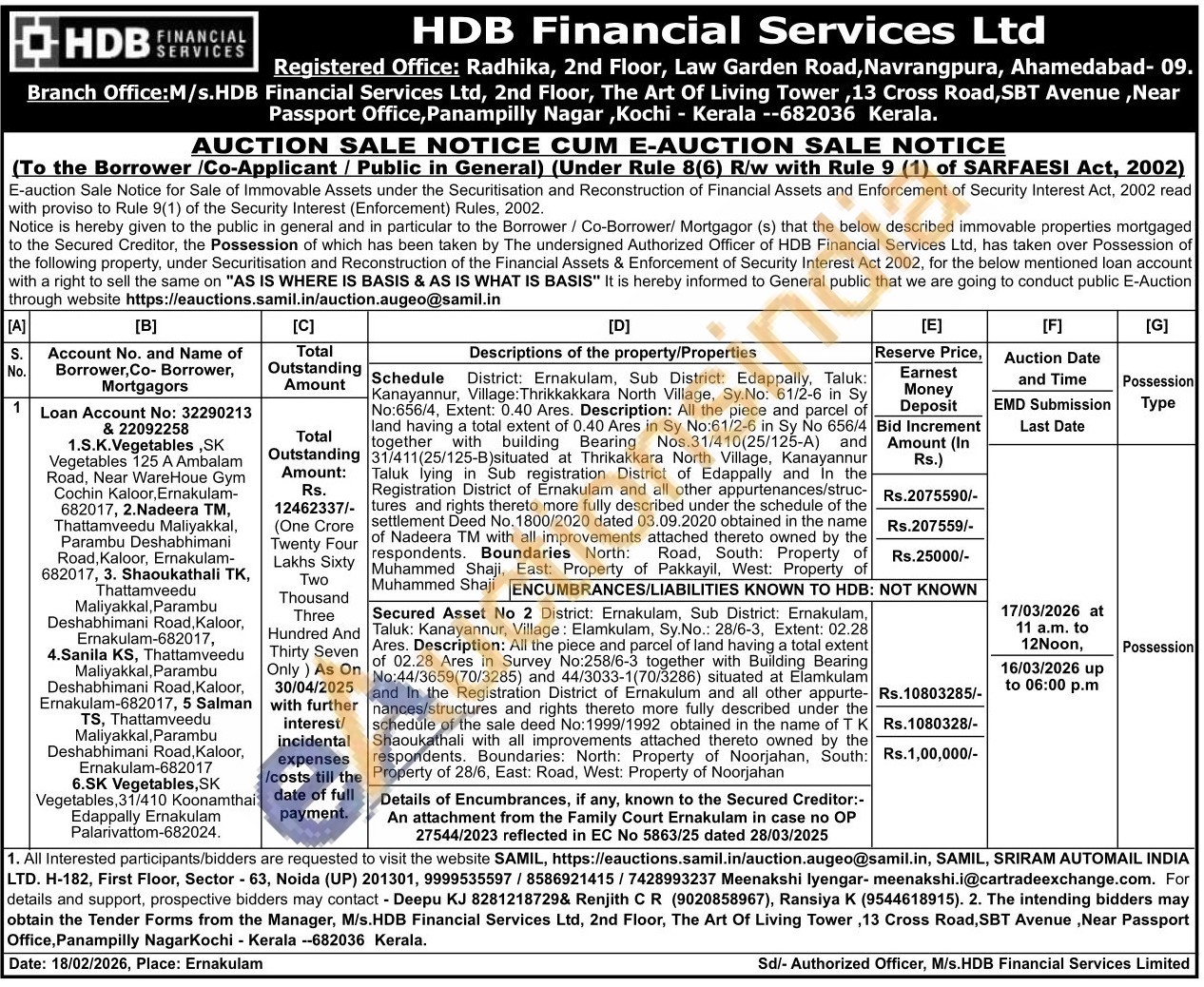 Secured Asset No 2 District: Ernakulam, Sub District: Ernakulam, Taluk: Kanayannur, Village: Elamkulam, Sy.No.: 28/6-3, Extent: 02.28 Ares. Description: All the piece and parcel of land having a total extent of 02.28 Ares in Survey No:258/6-3 together with Building Bearing No:44/3659(70/3285) and 44/3033-1(70/3286) situated at Elamkulam and in the Registration District of Ernakulum and all other appurte-nances/structures and rights thereto more fully described under the schedule of the sale deed No:1999/1992 obtained in the name of TK Shaoukathali with all improvements attached thereto owned by the respondents. Boundaries: North: Property of Noorjahan, South: Property of 28/6, East: Road, West: Property of Noorjahan