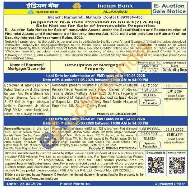 Property on part of khasra no 552(old), 533 ka kha(new), Part of khewat No. 40 Androon Madhav Villas, Mauza Vrindavan Bangar, Vrindavan, Tehsil and Distt. Mathura, Area: 132.38 Sq mt., in the name of Mrs. Jyoti Yadav Wio Mr. Manish Yadav & Mr. Manish Yadav Sio Mr. Dalvir Singh, Bounded as: East Other's Pict, West: Other's Plot. North: Property of Tulsi Swami South: 16 Ft. wo Road