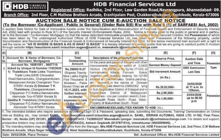 All the piece and parcel of the land with other improvements having an extent of 0.0405 Hectors (10 Cents) in Re. Sy No. 171/2G of Nannamukku Village, Ponnani thaluk together with building bearing No. 12/180 situated at Nannamukku Grama panchay ath recorded in the names of Dinesan described in Sale deed No.2368/2002 lying In Sub Registration District of Edappal and in Registration District of Malappuram Boundaries:- (As per Location sketch) East-Panchayath Road, North: Road, West-Property of Mukundhan South:- Road