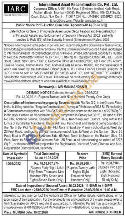 Description of the Immovable property/Secured Asset: Flat No. G-2, in the Ground Floor, in the building called as "Megala Constructions", having a Plinth area of 633 Sq. Ft (including a Common areas) together with 334 Sq. Ft of Undivided share on the land out of 2275 Sq Ft, In the layout known as Vedachalam Nagar, comprised in Survey No 361/3., situated at Plot No.916, Adhanur Village, Sriperumbudur Taluk, Kancheepuram District, lying within the Limits of Kundrathur Panchayat Union, Adhanur Panchayat and the land being bounded on the: North By- Plot No.915, South By-Plot No.917, East By-Primary School Land, West By-20 Feet Road, and having a linear measurement of, East to West on the Northem Side-65 Feet, East to West on the Southem Side-65 Feet, North to South on the Eastem Side-35 Feet, North to South on the Western Side- 35 Feet. In all admeasuring an extent of 2275 Sq.Ft., or thereabouts and lying within the Registration District of South Chennai and Sub-Registration District of Guduvanchery