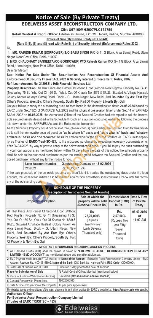 All That Piece And Parcel Of Second Floor (Without Roof Rights), Property No. G- 41 (Measuring 75 Sq Yds. Out Of 150 Sq. Yds.), Out Of Khasra No. 88/9 & 87/23, Situated At Village Hastsal, Colony Known As Arya Samaj Road, Block G. Uttam Nagar, New Delhi, And Bounded By As: East By: Other's Property, West By: Other's Property, South By: Part Of Property & North By: Gali