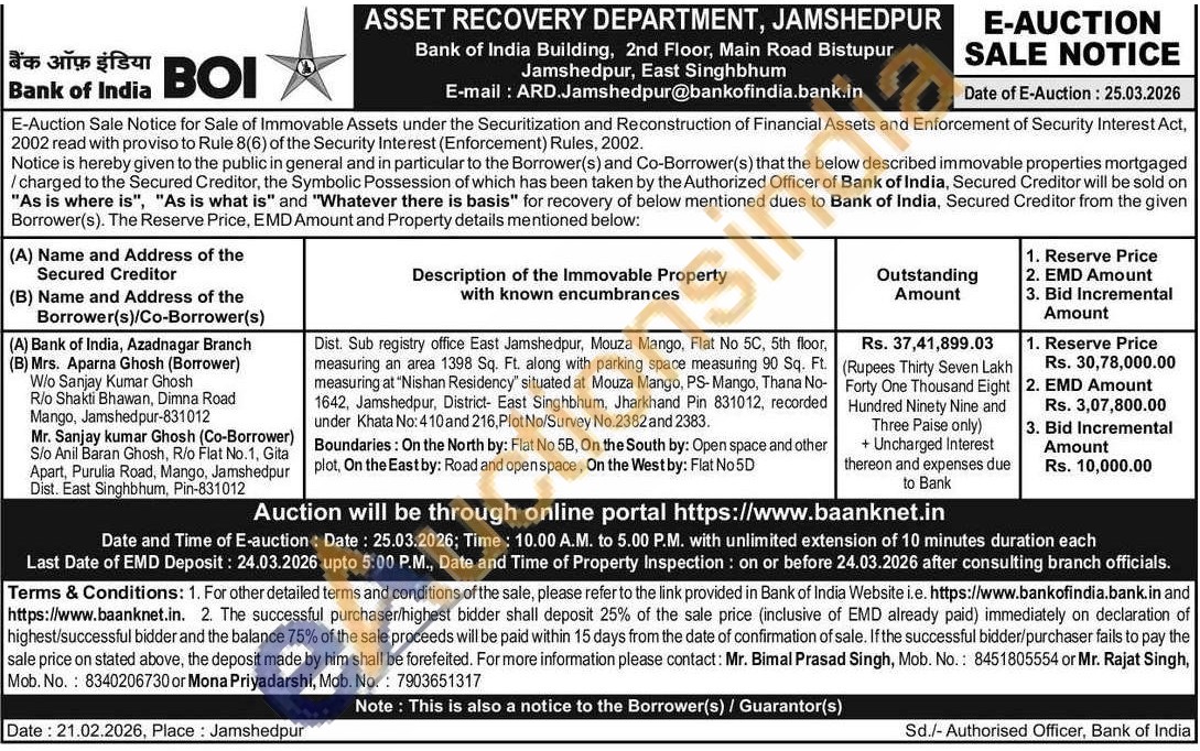 Dist. Sub registry office East Jamshedpur, Mouza Mango, Flat No 5C, 5th floor, measuring an area 1398 Sq. Ft. along with parking space measuring 90 Sq. Ft. measuring at "Nishan Residency" situated at Mouza Mango, PS-Mango, Thana No-1642, Jamshedpur, District- East Singhbhum, Jharkhand Pin 831012, recorded under Khata No: 410 and 216, Plot No/Survey No.2382 and 2383. Boundaries: On the North by: Flat No 58, On the South by: Open space and otherplot, On the East by: Road and open space, On the West by: Flat No 5D