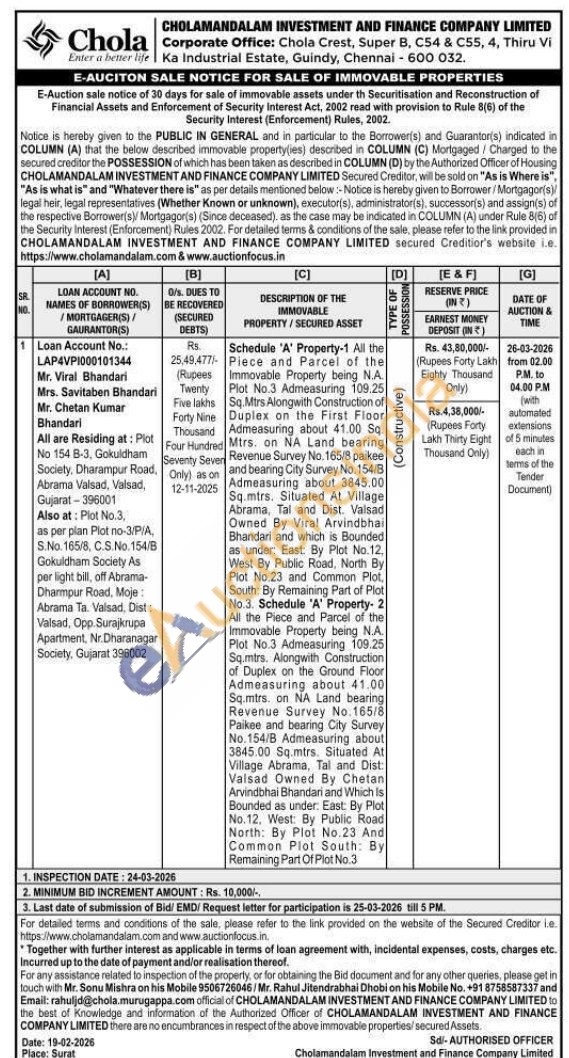 Schedule 'A' Property-1 All the Piece and Parcel of the Immovable Property being N.A. Plot No.3 Admeasuring 109.25 Sq.Mtrs Alongwith Construction of Duplex on the First Floor Admeasuring about 41.00 Sq. Mtrs. on NA Land bearing Revenue Survey No. 165/8 paikee and bearing City Survey No. 154/B Admeasuring about 3845.00 Sq.mtrs. Situated At Village Abrama, Tal and Dist. Valsad Owned By Viral Arvindbhai Bhandari and which is Bounded as under: East: By Plot No.12, West By Public Road, North By Plot No.23 and Common Plot, South: By Remaining Part of Plot No.3. Schedule 'A' Property- 2 All the Piece and Parcel of the Immovable Property being N.A. Plot No.3 Admeasuring 109.25 Sq.mtrs. Alongwith Construction of Duplex on the Ground Floor Admeasuring about 41.00 Sq.mtrs. on NA Land bearing Revenue Survey No. 165/8 Paikee and bearing City Survey No.154/B Admeasuring about 3845.00 Sq.mtrs. Situated At Village Abrama, Tal and Dist: Valsad Owned By Chetan Arvindbhai Bhandari and Which is Bounded as under: East: By Plot No.12. West: By Public Road North: By Plot No.23 And Common Plot South: By Remaining Part Of Plot No.3