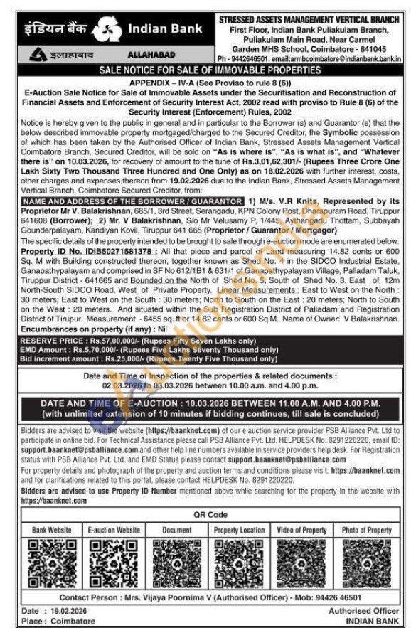 All that piece and parcel of Land measuring 14.82 cents or 600 Sq. M with Building constructed thereon, together known as Shed No. 4 in the SIDCO Industrial Estate, Ganapathypalayam and comprised in SF No 612/1B1 & 631/1 of Ganapathypalayam Village, Palladam Taluk, Tiruppur District-641665 and Bounded on the North of Shed No. 5, South of Shed No. 3, East of 12m North-South SIDCO Road, West of Private Property. Linear Measurements: East to West on the North: 30 meters; East to West on the South: 30 meters; North to South on the East: 20 meters; North to South on the West: 20 meters. And situated within the Sub Registration District of Palladam and Registration District of Tirupur. Measurement-6455 sq. ft or 14.82 cents or 600 Sq M. Name of Owner: V Balakrishnan.