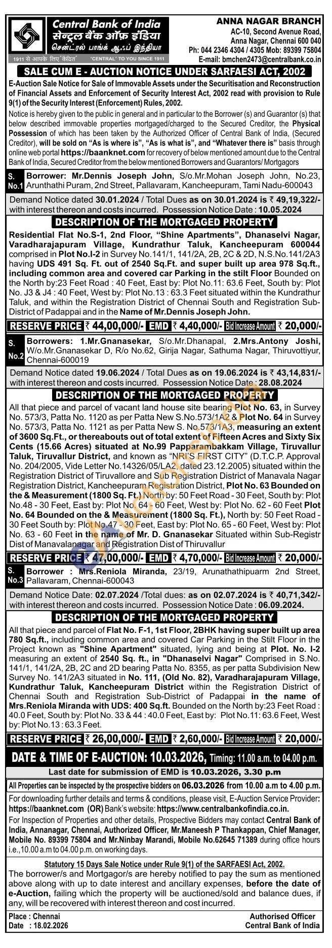 Residential Flat No.S-1, 2nd Floor, "Shine Apartments", Dhanaselvi Nagar, Varadharajapuram Village, Kundrathur Taluk, Kancheepuram 600044 comprised in Plot No.1-2 in Survey No. 141/1, 141/2A, 2B, 2C & 2D, N.S.No. 141/2A3 having UDS 491 Sq. Ft. out of 2540 Sq.Ft. and super built up area 978 Sq.ft., including common area and covered car Parking in the stilt Floor Bounded on the North by:23 Feet Road: 40 Feet, East by: Plot No. 11: 63.6 Feet, South by: Plot No. J3 & J4: 40 Feet, West by: Plot No. 13: 63.3 Feet situated within the Kundrathur Taluk, and within the Registration District of Chennai South and Registration Sub-District of Padappai and in the Name of Mr. Dennis Joseph John