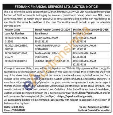 Fedbank Financial Services Ltd Gold Auctions Auction in Coimbatore