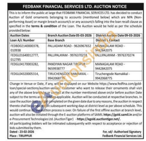 Fedbank Financial Services Ltd Gold Auctions Auction in Coimbatore