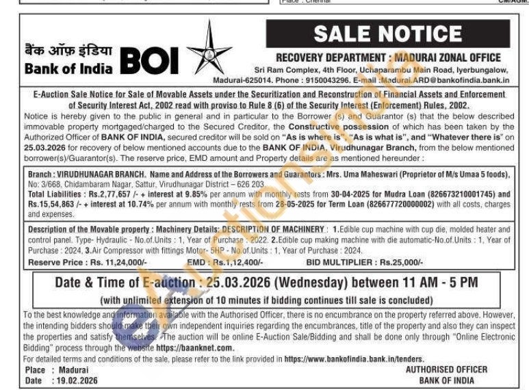 Contact no : 9150043296. E-mail:Madurai.ARD@bankofindia.bank.in