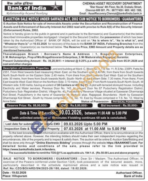 Land and building at Ward-C, Block No. 7. T.S. No. 11, R.S No. 239Pt, Patta No 2351, From West towards East measuring West-East: on the Southern side: 4.40 Mir, from there from South towards North South-North on the Eastern Side: 2.40 metre, From there from West towards East West East on the Southem side: 30 metre, from there from South towards North, South-North on the Eastern Side: 7.30 metre, From there, From East towards West: East-West on the Northern Side: 3.10 metre, From there, From North towards South North-South, ill Western side. 9.80 metre, having an extent of 38 Cantiars or 409 Sq. Ft.. A plot with terraced storeyed house. Including Electricity and Water services. Previous Door No. 143. At present Door No 67 Puducherry Registration District, Puducherry Sub-Registration District, Village No. 40, Pududcherry Revenue Village situated at Easwaran Dharmaraja Koil Street, Pududcherry in the name of Guarantor Mr Madurai alias. Rajagopal, Boundaries: -North by Easwaran Dharmaraja Koil Street, South by House comprised in T.S. No. 10. East by House comprised in TS. No. 12, West by Anna Salai