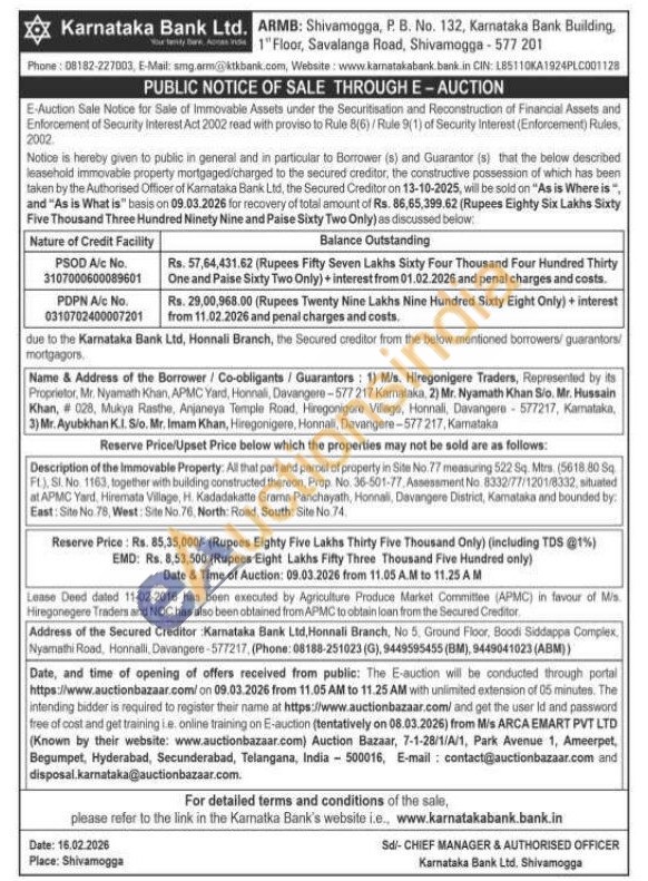 Description of the Immovable Property: All that part and parcel of property in Site No. 77 measuring 522 Sq. Mtrs. (5618.80 Sq Ft), Sl. No. 1163, together with building constructed thereon, Prop. No. 36-501-77, Assessment No. 8332/77/1201/8332, situated at APMC Yard, Hiremata Village, H. Kadadakatte Grama Panchayath, Honnali, Davangere District, Kamataka and bounded by: East: Site No. 78, West: Site No. 76, North: Road, South: Site No. 74.