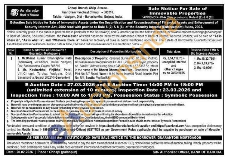 Description of Property: Revenue Survey No 80 paiky, Plot No. B/05 Assesment Registrar of CHHAPI Gram Panchayat, property no 3440/11 Admeasuring about 945.47 Sq.fti.e 87.8367 Sq. Meter in the name of Mr. Bharat Dhanrajbhai Patel. Boundries: East: Plot No B/7 Road, West: 9.14 Meter Internal Road, North: Plot No. B/4, South: Plot No 8/6.