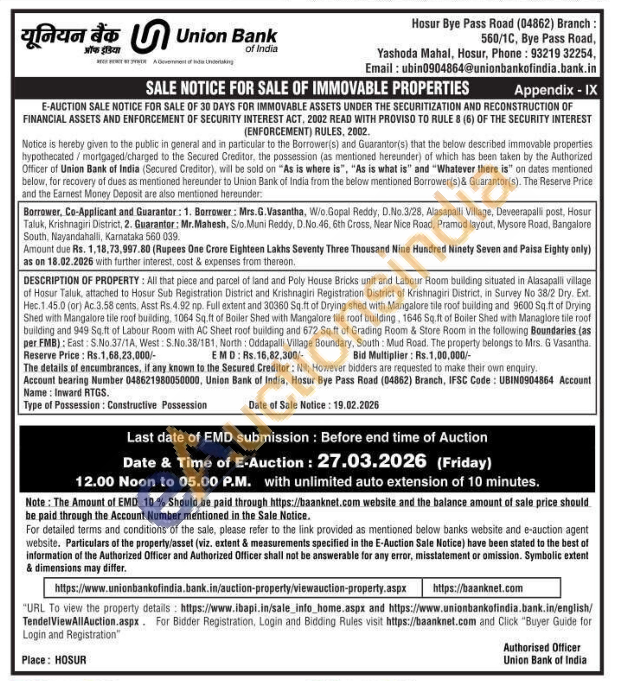 DESCRIPTION OF PROPERTY: All that piece and parcel of land and Poly House Bricks unit and Labour Room building situated in Alasapalli village of Hosur Taluk, attached to Hosur Sub Registration District and Krishnagiri Registration District of Krishnagiri District, in Survey No 38/2 Dry. Ext. Hec. 1.45.0 (or) Ac.3.58 cents, Asst Rs.4.92 np. Full extent and 30360 Sq.ft of Drying shed with Mangalore tile roof building and 9600 Sq.ft of Drying Shed with Mangalore tile roof building, 1064 Sq.ft of Boiler Shed with Mangalore tile roof building, 1646 Sq.ft of Boiler Shed with Managlore tile roof building and 949 Sq.ft of Labour Room with AC Sheet roof building and 672 Sq.ft of Grading Room & Store Room in the following Boundaries (as per FMB): East: S.No.37/1A, West: S.No.38/181, North: Oddapalli Village Boundary, South: Mud Road. The property belongs to Mrs. G Vasantha