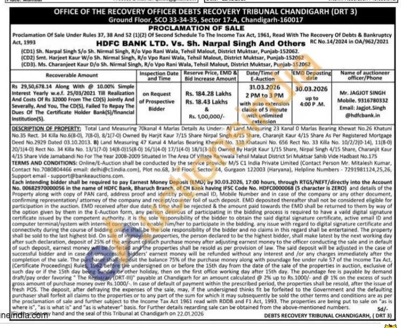 DESCRIPTION OF PROPERTY: Total Land Measuring 70kanal 4 Marlas Details As Under:- A) Land Measuring 23 Kanal O Marlas Bearing Khewat No.26 Khatuni No.35 Rect. 34 Killa No.6(8-0), 7(8-0), 8/1(7-0) Owned By Harjit Kaur 7/15 Share Nirpal Singh 4/15 Share, Charanjit Kaur 4/15 Share As Per Registered Mortgage Deed No.2929 Dated 03.10.2013. B) Land Measuring 47 Kanal 4 Marlas Bearing Khewat No. 338 Khatauni No. 656 Rect No. 33 Killa No. 10/2/2(0-14), 11(8-0) 20/1(4-0) Rect No. 34 Killa No. 13/1(7-0) 14(8-0)15(8-0) 16/1(4-0) 17/1(4-0) 18/1(3-10) Owned By Harjit Kaur 1/15 Share, Nirpal Singh 4/15 Share, Charanjit Kaur 4/15 Share Vide Jamabandi No For The Year 2008-2009 Situated in The Area Of Village Raniwala Tehsil Malaut District Sri Muktsar Sahib Vide Hadbast No.175