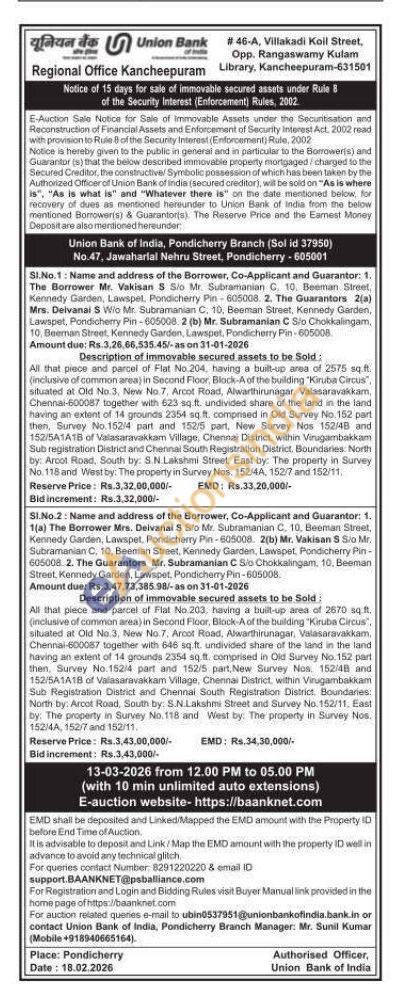 All that piece and parcel of Flat No. 203, having a built-up area of 2670 sq ft. (inclusive of common area) in Second Floor, Block-A of the building "Kiruba Circus", situated at Old No.3, New No.7, Arcot Road, Alwarthirunagar, Valasaravakkam. Chennai-600087 together with 646 sq.ft. undivided share of the land in the land having an extent of 14 grounds 2354 sq.ft. comprised in Old Survey No. 152 part then, Survey No 152/4 part and 152/5 part,New Survey Nos. 152/48 and 152/5A1A1B of Valasaravakkam Village, Chennai District, within Virugambakkam Sub Registration District and Chennai South Registration District Boundaries: North by Arcot Road, South by. S.N.Lakshmi Street and Survey No. 152/11, East by: The property in Survey No. 118 and West by. The property in Survey Nos. 152/4A, 152/7 and 152/11