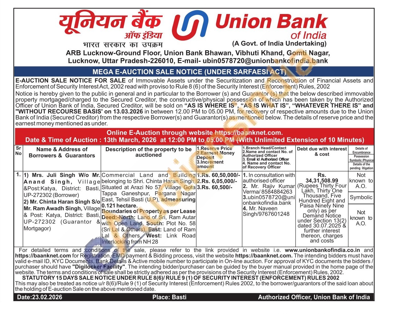 Commercial Land and Building belonging to Shri. Chinta Haran Singh, Situated at Arazi No 57, Village Gota Tappa Ganeshpur, Pargana Nagar East, Tehsil Basti (U.P), admeasuring 0.121 hectare. Boundaries of Property as per Lease Deed:-North: Land of Sri, Ram Autar with Open Land, South: Plot No. 58 (Sri Lal & Others), East: Land of Ram Lal & Others, West: Link Road Interlocking from NH 28