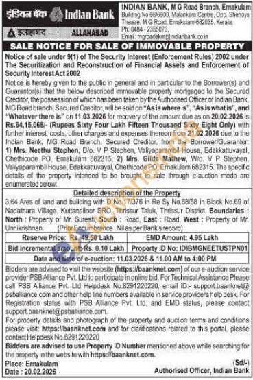 Detailed description of the Property : 3.64 Ares of land and building with D No. 17/376 in Re Sy No.68/58 in Block No.69 of Nadalhara Village, Kuttanalloor SRO, Thrissur Taluk, Thrissur District. Boundaries: North Properly of Mr. Suresh, South Road, East Road, West: Property of Mr. Unnikrishnan. (Prior Encumbrance: Nil as per Bank's record)