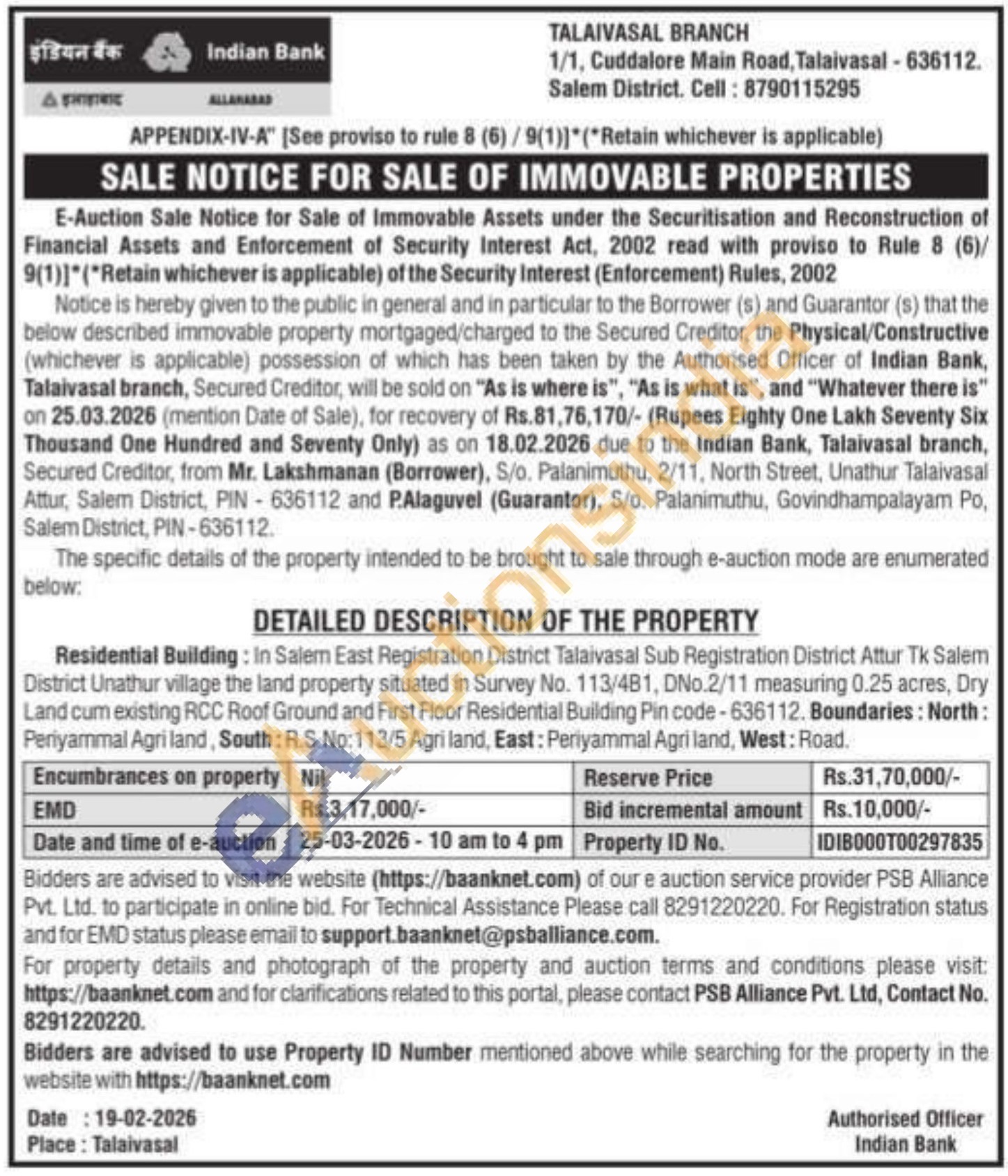DETAILED DESCRIPTION OF THE PROPERTY : Residential Building: In Salem East Registration District Talaivasal Sub Registration District Attur Tk Salem District Unathur village the land property situated in Survey No. 113/481, DNo.2/11 measuring 0.25 acres, Dry Land cum existing RCC Roof Ground and First Floor Residential Building Pin code-636112. Boundaries: North: