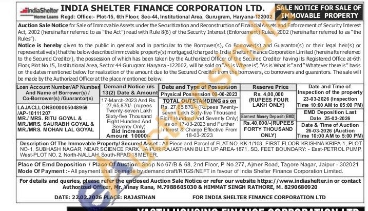 Description Of The Immovable Property/Secured Asset: All Piece and Parcel of FLAT NO. KK-1/103, FIRST FLOOR KRISHNA KRIPA-1, PLOT NO-1, SUBHASH NAGAR, NEAR SCIENCE PARK, JAIPUR RAJASTHAN BUILT UP AREA-1871. SQ. FEET BOUNDARY East-PETROL PUMP, West-PLOT NO. 2, North-NALLAH, South-RPAD 18 METER..