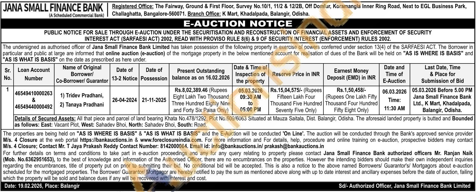 Details of Secured Assets: All that piece and parcel of land bearing Khata No.478/1292, Plot No.609/6063 Situated at Mauza Saitala, Dist. Balangir, Odisha. The aforesaid landed property is butted and Bounded as follows: East: Vacant Plot, West: Sahadev Bhoi, North: Sahadev Bhoi, South: Road